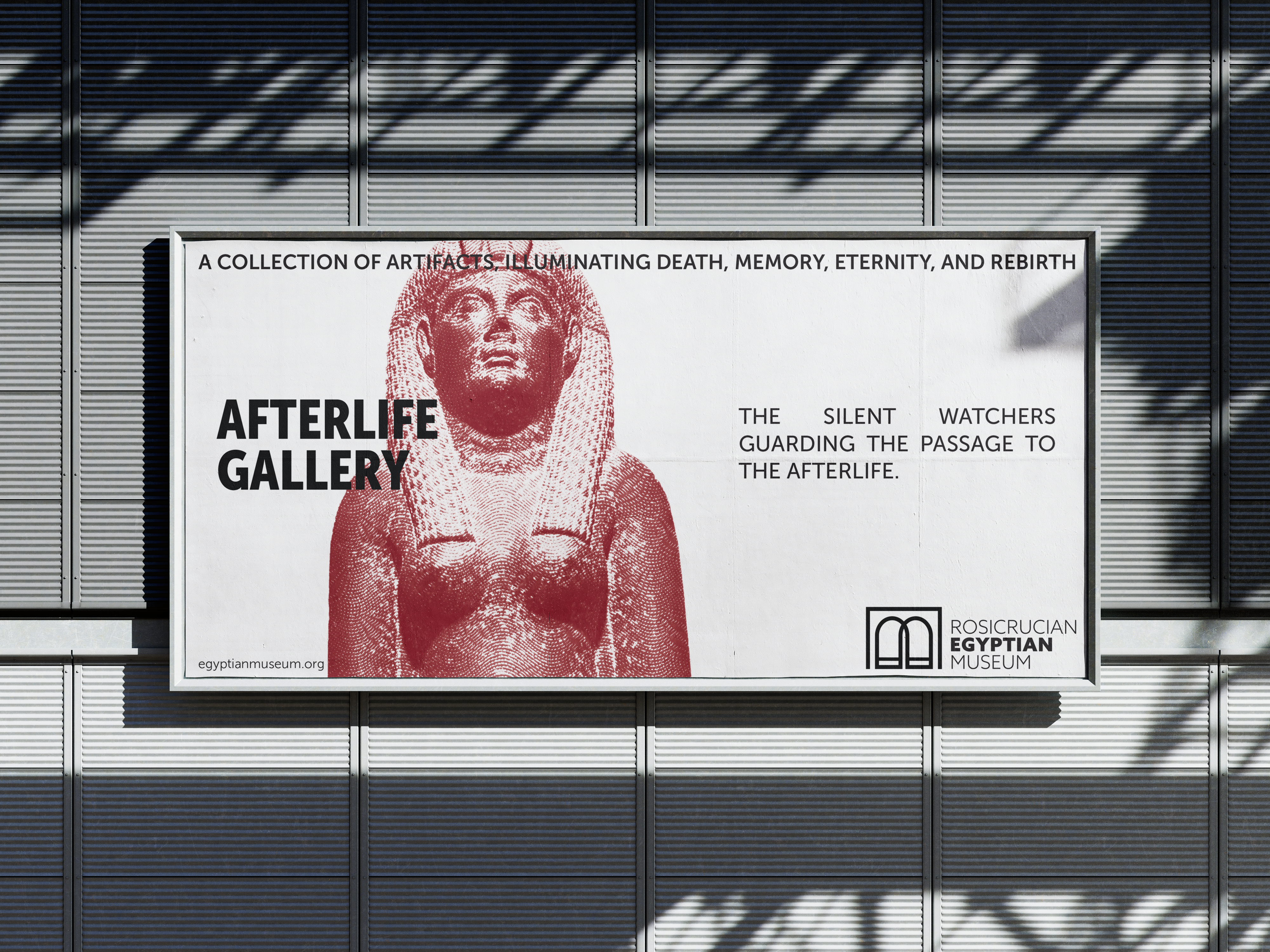 The print advertising expands the rebrand beyond the museum walls, introducing the Afterlife Gallery to a broader public audience. Through bold, visually compelling poster designs and cohesive messaging, it increases visibility and positions the museum as a contemporary cultural destination. This approach helps generate curiosity, strengthen brand recognition, and attract new visitors who may not have previously knew of the museum.