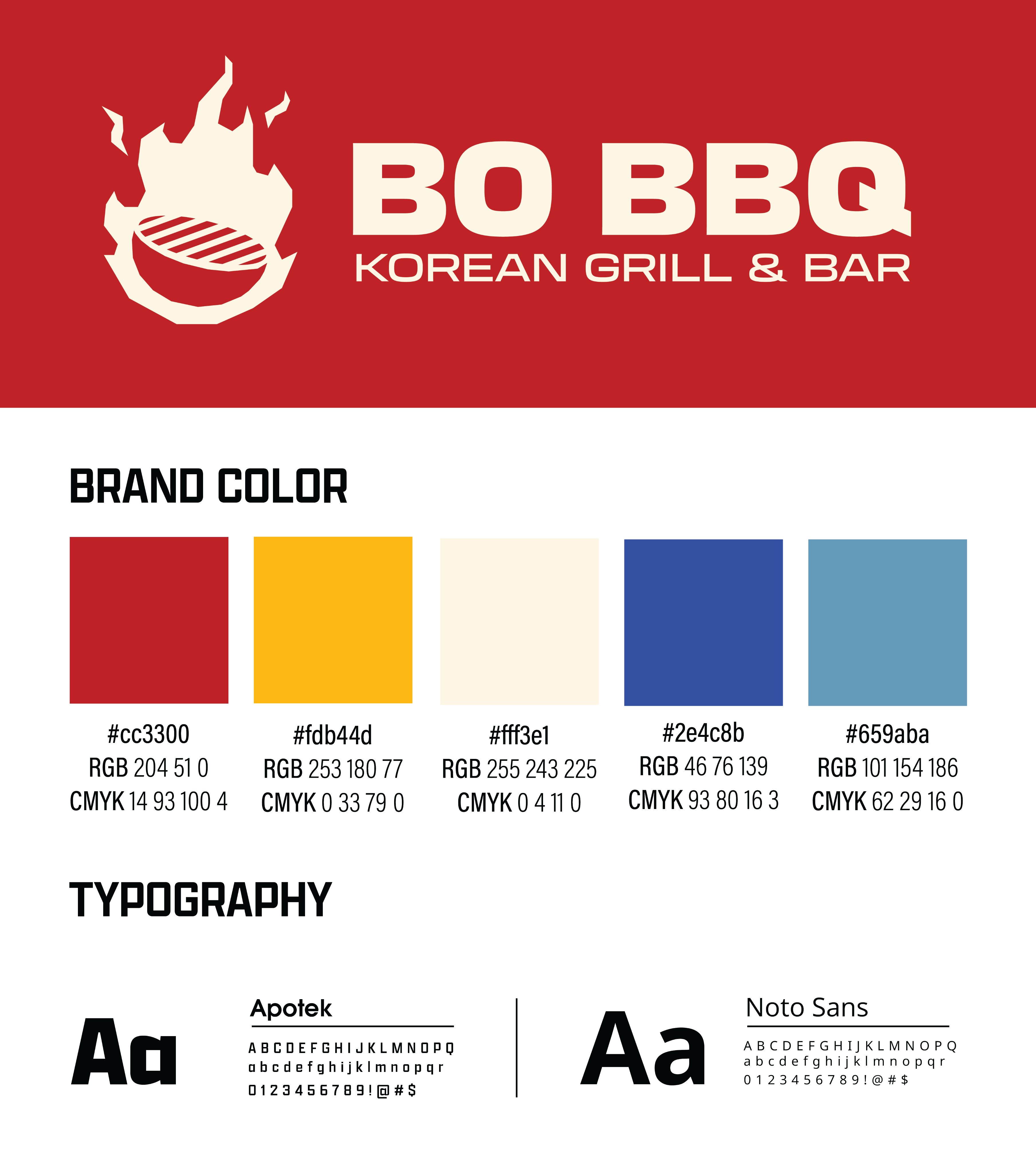 Supporting colors draw inspiration from rich marinades, rising grill smoke, and the cool metallic tones of cooking tools, balanced by a soft off-white that keeps the palette clean and inviting. Paired with the expressive Apotek typeface and the highly readable Noto Sans, the visual system combines personality with clarity. Combined these elements create a vibrant, cohesive brand that feels modern, welcoming, and easy to navigate for diners.